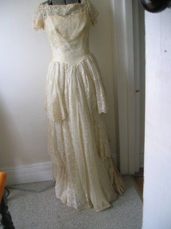 Hello, I have taken on the task to restore my mothers wedding gown. It dates back to 1958. The bodice and skirt are both embroided lace that lays over a satin lining. It is flat in the front torso and has three tiers of gathered lace on the rear portion of the skirt. The lace is discolored to yellowish-brown and the toule underneath in dried out and brittle. I would like to send to you a picture for any advice.